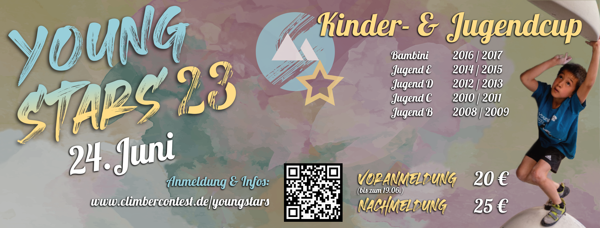 Klein ganz Groß! Boulder Olymp lädt zu seinem Kinder & Jugend Wettkampf ein. Bei Young Stars dreht sich alles um die jungen Wilden. Starten darf jede/r zwischen 6 und 13 Jahren, der/die Spaß am Bouldern hat. Altersklassen: Jugend F 2017/2018 Jugend E 2015/2016 Jugend D 2013/2014 Jugend C 2011/2012 Zeitplan: 10:00 – 11:00 Hallen Öffnung/Anmeldung (danach Anmeldung am Bistro) 11:00 – 11:30 Begrüßung/Wichtige Informationen 11:30 – 14:30 Qualifikation 15:30 – 16:30 Finale Jugend D 17:30 – 18:30 Finale Jugend C im Anschluss – Siegerehrung aller Klassen Ablauf Quali: Jede Altersklasse klettert 15 Boulder von insgesamt 30 geschraubten Qualifikations Boulder, dafür haben sie 3 Stunden Zeit. Für jeden Boulder gibt es 5 Versuche, nach jedem Versuch muss man sich erneut anstellen. Jeder Boulder gibt max. 25 Punkte. Dieses Jahr werden auch einige Special Aufgaben dabei sein, seid gespannt! Ablauf Finale: 6 Teilnehmer der Jugend D/C, männlich/weiblich kommen ins Finale. Dort werden 3 Boulder im Intervall Modus in 5 min geklettert.) Voranmeldung 30€ (bis zum 24.06.) unter https://www.boulderolymp.de/young-stars-24 Frist vorbei? Nicht geschafft sich anzumelden oder spontan entschieden? Am 29.06.24 zwischen 10:00 - 11:00 Uhr könnt ihr euch bei uns vor Ort im Bereich "Nachmeldung" anmelden und die Nachmeldegebühr von 35€ bei uns entrichten.